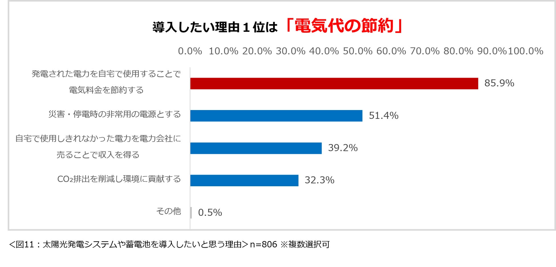 また、太陽光発電システムや蓄電池を導入したいと回答した806名に、その理由について尋ねたところ、「発電された電力を自宅で使用することで電気料金を節約するため」という回答が最も多く85.9%、次いで「災害・停電時の非常用の電源とするため」という回答も51.4%という結果になりました。(図11)