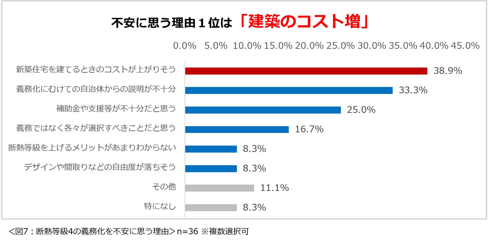 一方で、不安に思うと回答した36名に、その理由を尋ねたところ、「新築住宅を建てるときのコストが上がりそうだから」という回答が最も多く38.9%という結果になりました。(図7)