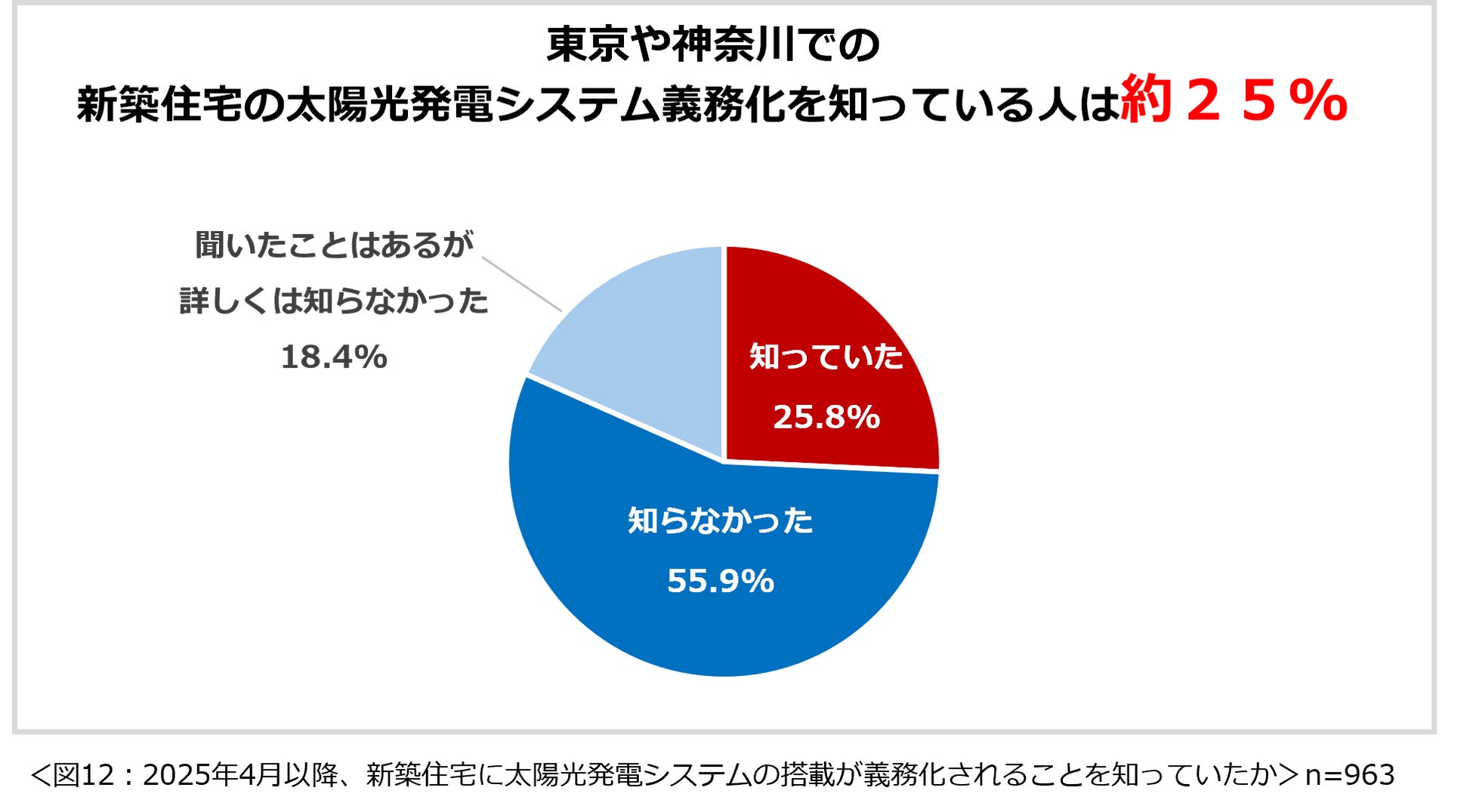 「東京都や神奈川県川崎市で、今年4月以降に建てる新築住宅に太陽光発電システムの設置が義務化されることを知っていましたか?」と尋ねたところ、「知っていた」という人は25.8%という結果になりました。(図12)