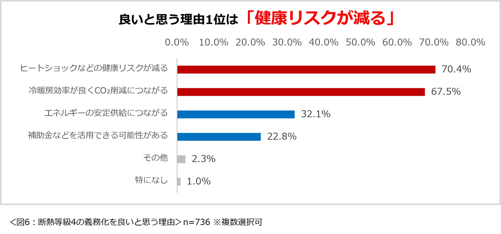 「良いと思う」と回答した736名に、その理由を尋ねたところ、「ヒートショックなどの健康リスクが減るから」という回答が最も多く70.4%、次に「冷暖房効率が良くCO₂削減につながる」(67.5%)が続きました。(図6)