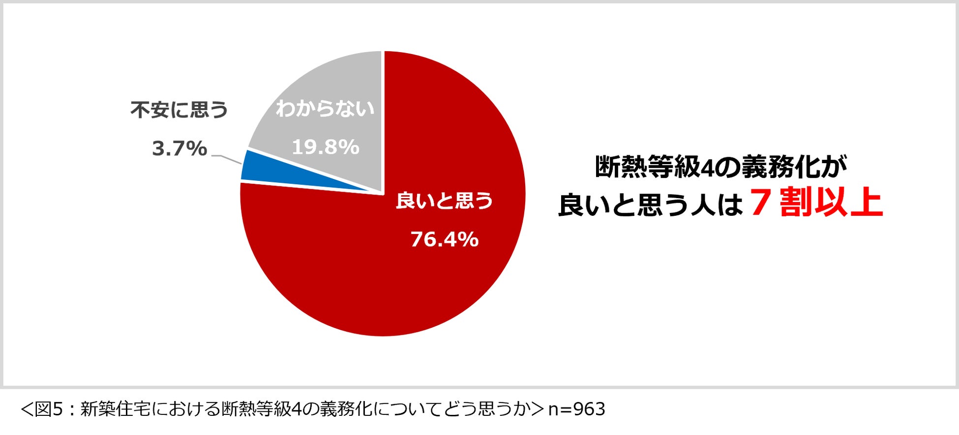 「今年4月に、断熱等級4が新築住宅の最低基準(義務化)となることについてどう思いますか?」と尋ねたところ、「良いと思う」と回答した人は76.4%という結果になりました。(図5)