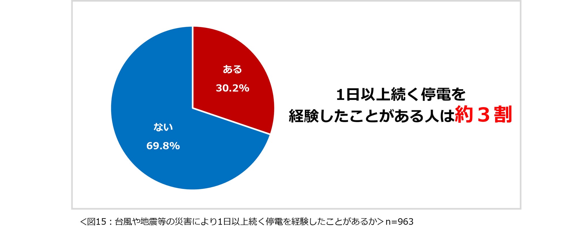 「台風や地震等の災害により1日以上続く停電を経験したことはありますか?」と尋ねたところ、「ある」と回答した人は30.2%でした。(図15)