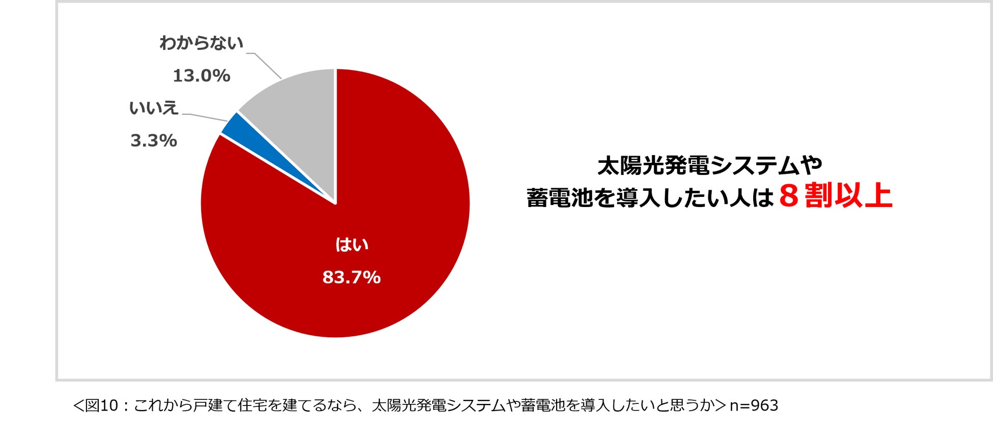 「これから戸建て住宅を建てるなら、太陽光発電システムや蓄電池を導入したいと思いますか?」と尋ねたところ、83.7%の人が「はい」と回答しています。(図10)
