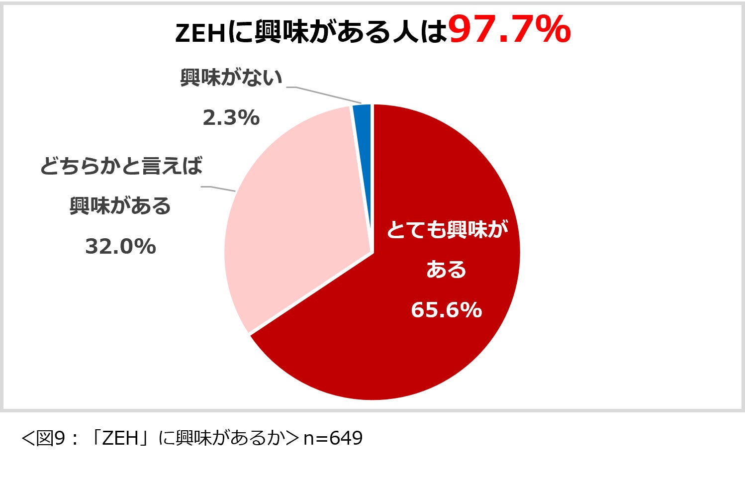 現在、ZEH基準を満たした省エネ住宅にお住まいではない、またはわからないと回答した649名に、「ZEHに興味はありますか?」と尋ねたところ、「とても興味がある」(65.6%)、「どちらかと言えば興味がある」(32.0%)を合わせると、97.7%の人が興味を持っていることが分かりました。(図9)