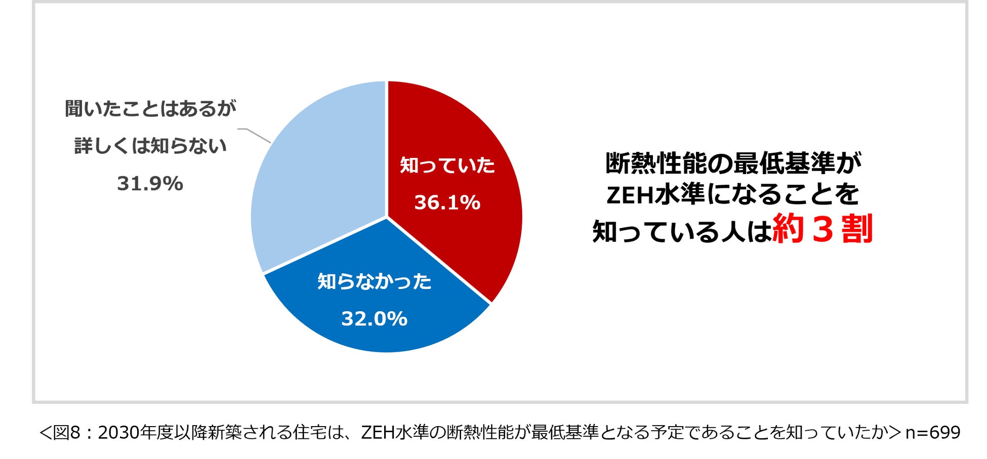 「ZEH(Net Zero Energy House[ネット・ゼロ・エネルギー・ハウス])」を知っていると回答した699名に、「2030年度以降新築される住宅は、ZEH水準の断熱性能が最低基準となる予定であることを知っていましたか?」と尋ねたところ、「知っていた」と回答した人は36.1%でした。(図8)