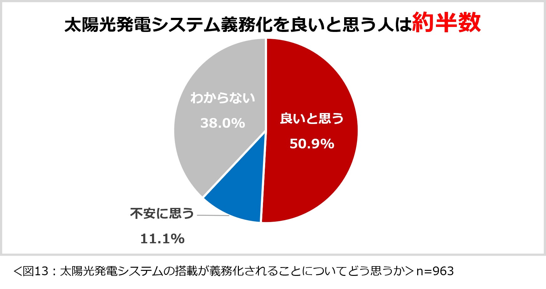 また、「太陽光発電システムの設置が義務化されることについてどう思いますか?」と尋ねたところ、「良いと思う」と回答した人は50.9%、「不安に思う」と回答した人は11.1%でした。(図13)