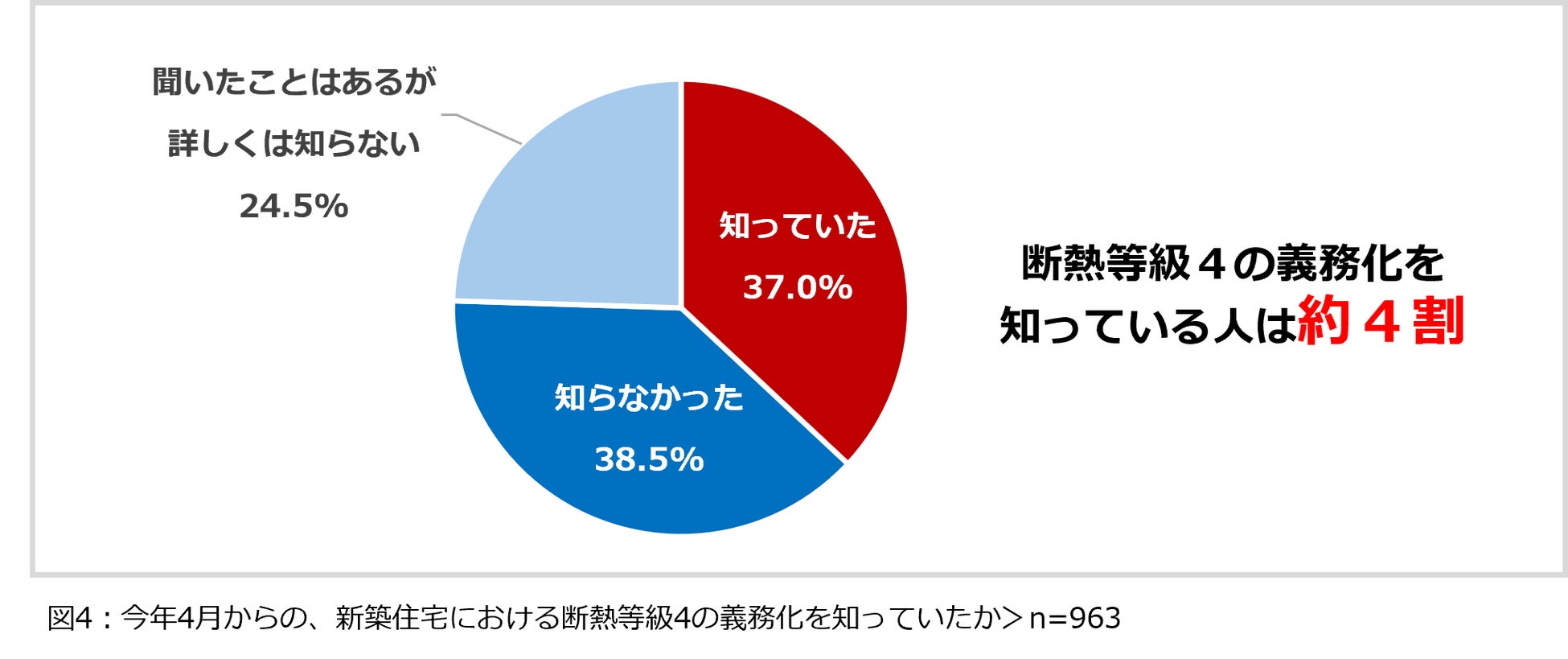 「2022年までは最高基準であった断熱等級4が、今年4月より新築住宅の最低基準(義務化)となることを知っていましたか?」と尋ねたところ、「知っていた」と回答した人は37%でした。(図4)