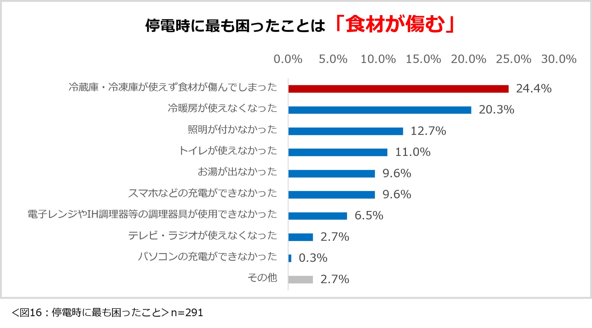 なお、「ある」と回答した291名に、停電時に最も困ったことを尋ねたところ、「冷蔵庫・冷凍庫が使えず食材が傷んでしまった」という回答が最も多く24.4%という結果になりました。(図16)