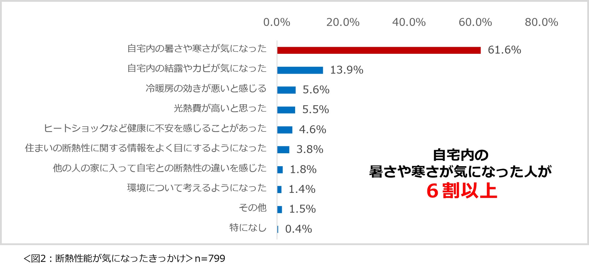 また、「よくある」「ある」と回答した799名に、断熱性能が気になったきっかけを尋ねたところ、「自宅内の暑さや寒さが気になったから」という回答が最も多く61.6%という結果になりました。(図2)