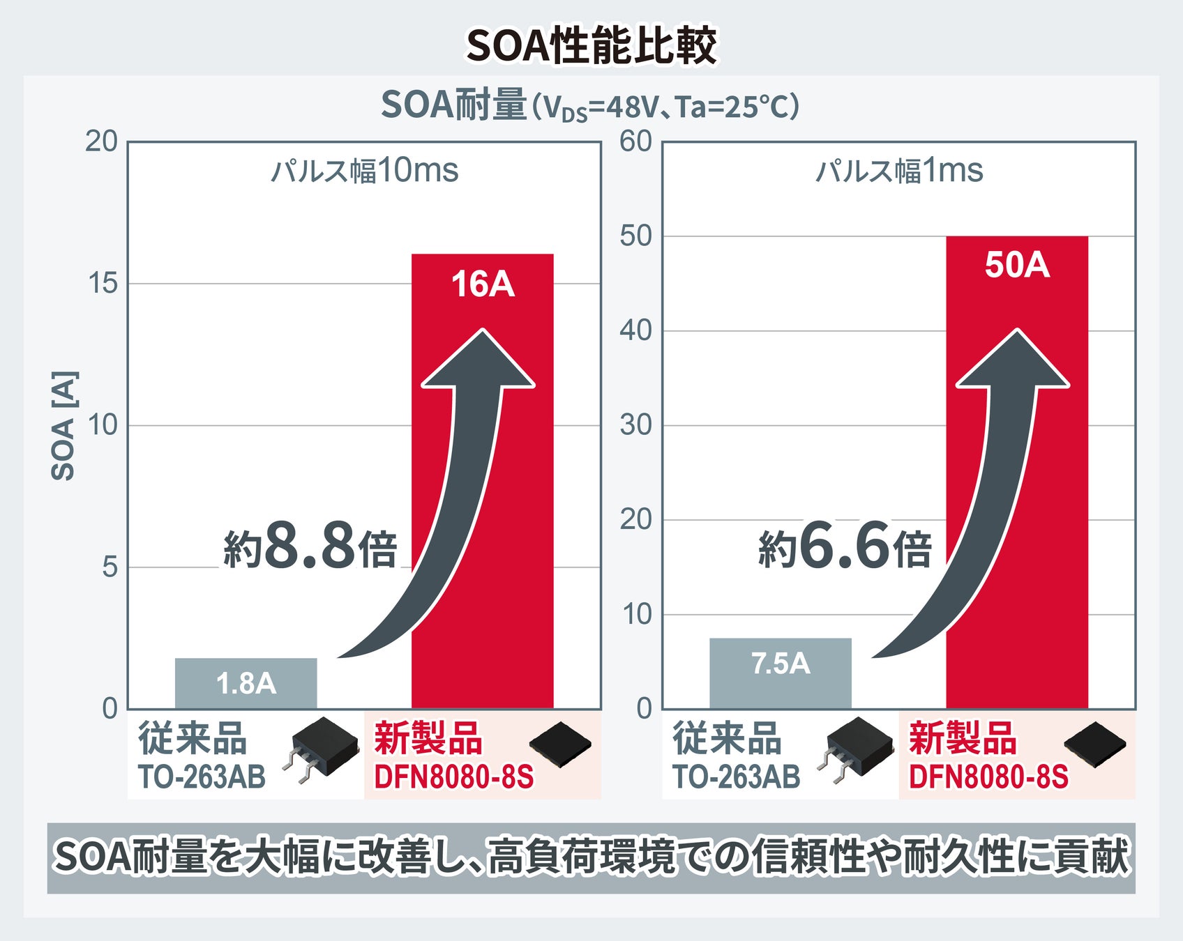 新製品は、今後需要の拡大が見込まれる8080サイズのMOSFETで、既存品からの置き換えが容易です。また、高SOA耐量(*3)(条件:VDS=48V、Pw=1ms / 10ms)と低ON抵抗(RDS(on))(*4)を両立。これにより、ホットスワップ(電源投入)動作時の高い製品信頼性を確保しながら、電源の効率を最適化し、消費電力と発熱の低減を可能にします。