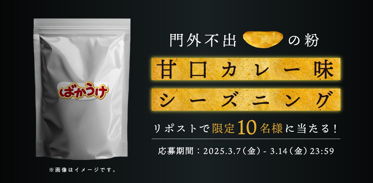2025年3月7日(金)より、甘口カレー味の“シーズニング”が当たるSNSキャンペーンをXにて実施いたします。シーズニングは、料理の調味料として幅広く使うことができ、様々な料理で“甘口カレー味”を楽しむことができます。甘口カレー派の皆さまは、奮ってご参加ください。