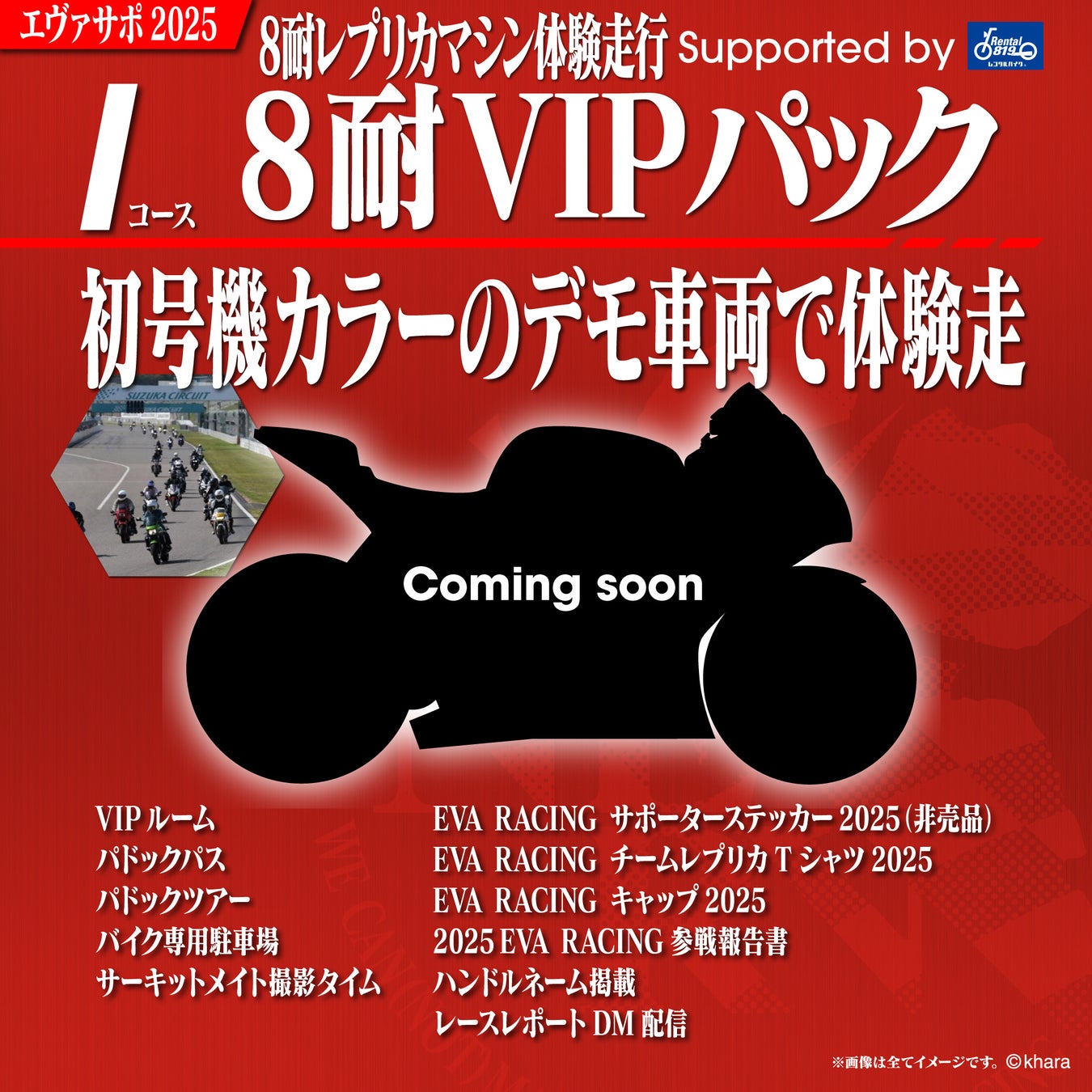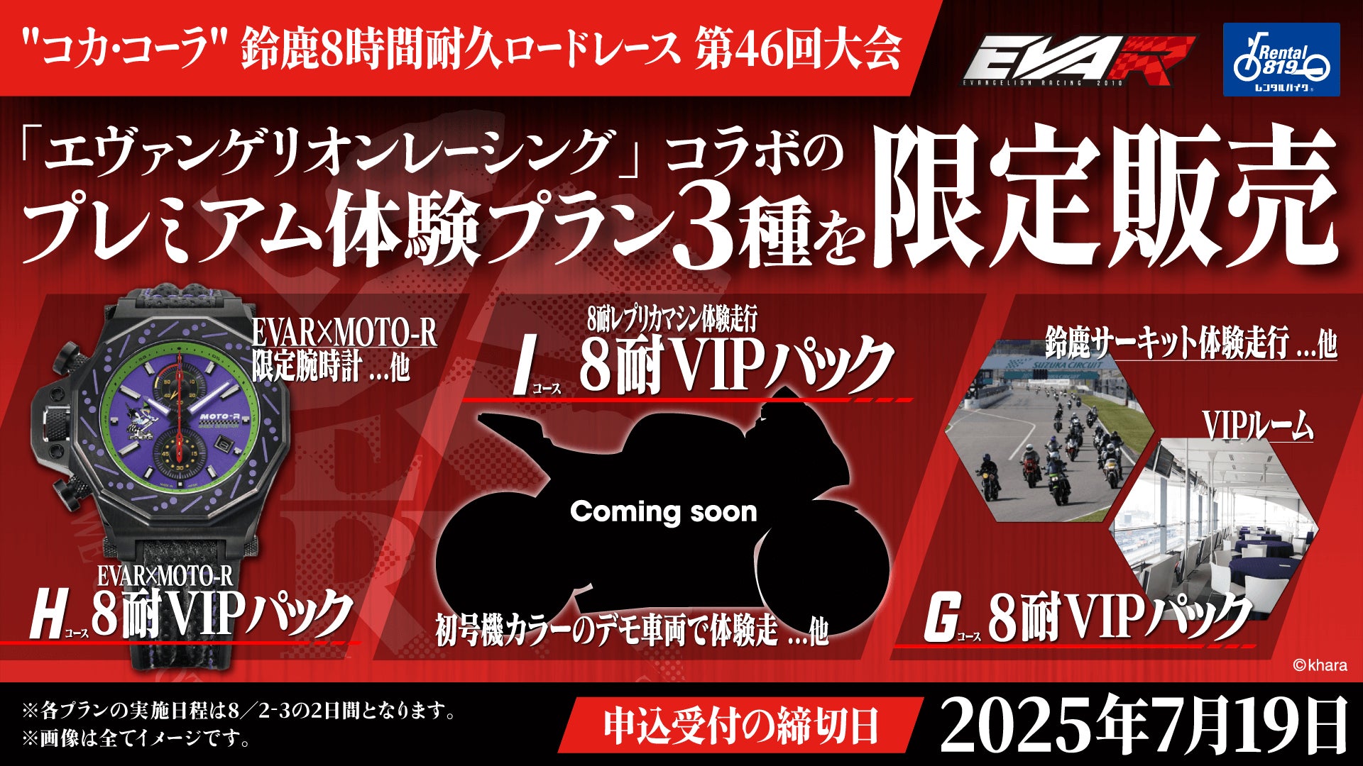 これに伴い、2025年8月に鈴鹿サーキットで開催される国内最高峰のバイクレース「FIM世界耐久選手権 "コカ・コーラ" 鈴鹿8時間耐久ロードレース(通称:鈴鹿8耐)」にて、エヴァレーシングの世界観とレースの熱狂を“リアルに体感”できる【特別体験プラン】を数量限定でご用意いたしました。