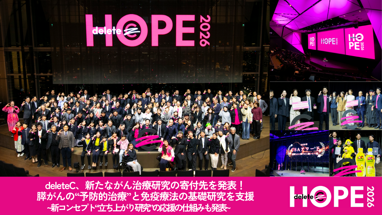 認定NPO法人deleteC(デリート・シー 代表理事:小国士朗)は、2月4日のワールドキャンサーデー(世界対がんデー)に先駆けて、2026年2月3日(火)に第7回目となる授賞式「deleteC 2026 -HOPE-」を都内・虎ノ門ヒルズ ステーションタワー TOKYO NODE HALLにて開催し、新たな支援先として、難治がんである膵がんの予防的治療を目的とした研究と近年ノーベル賞などでも注目されている免疫療法を軸とした基礎研究の2研究を発表しました。