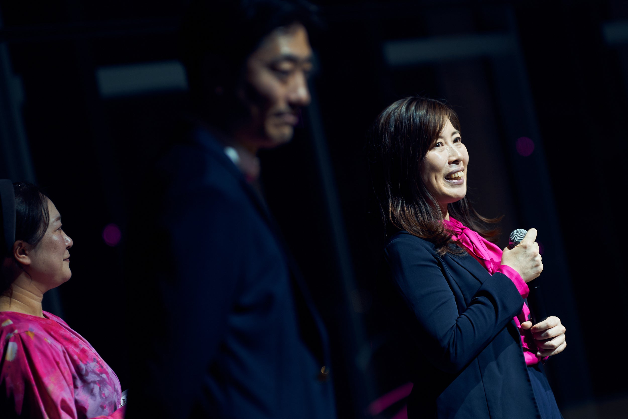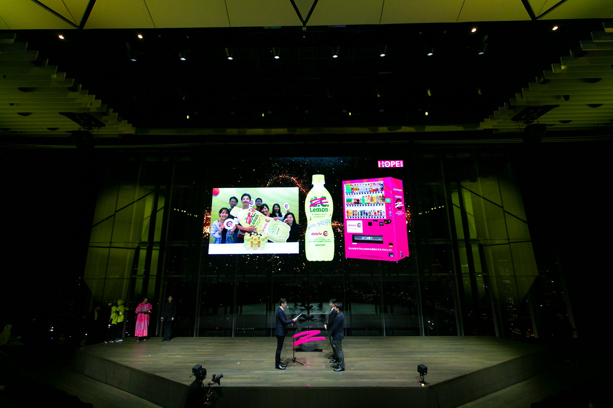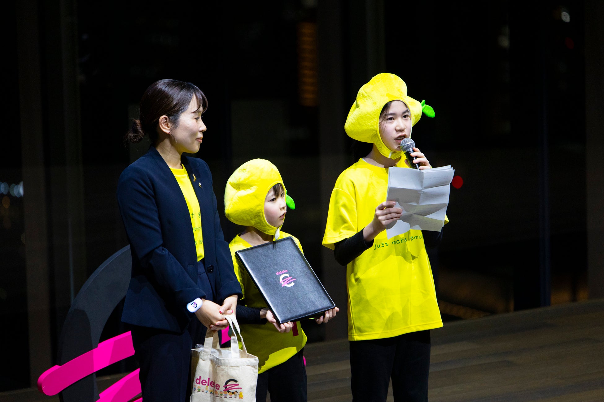 受賞されたみなさま、そして今日この日のために会場に駆けつけてくださったみなさま、本当にありがとうございます。心よりおめでとうございます。はじめて C.C.レモンの「C」が消えて嬉しかった日のことや、1台目の deleteC モデルの自動販売機を設置していただいた日のことを、あらためて思い返していました。7年前、deleteC が立ち上がったばかりの頃、この活動に参加してくださるのは、ほんの一握りでした。それが今では、本当にたくさんの方が参加してくださり、今日は 8つのアクションを表彰することができました。このほかにも、お散歩やアプリの開発など、さまざまな形でアクションが広がっていることも実感しています。CSAアワードは、今年はじめての試みでしたが、正直、どのアクションも素晴らしく、そのどれもが尊くて、選ぶことはとても難しかったです。カジュアルソーシャルアクションは、名前のとおりかろやかなアクションですが、その一つひとつが実現するまでには、多くの人たちが情熱を注ぎ、実現するために日々向き合ってくださっています。その姿を、私たちはずっと見てきました。今日ここにいる方、そして今も一緒に取り組んでくださっているすべての方に、心から感謝を伝えたいと思います。想いを共にして一緒に取り組んでいくことで、がんを治せる病気にする日に、私たちは確実に一歩近づき、手繰り寄せることができると信じています。そして、この活動が続いていくことが希望だと感じています。これからもぜひ、一緒に進めていただけたら嬉しく思います。今日は本当に、ありがとうございました。
