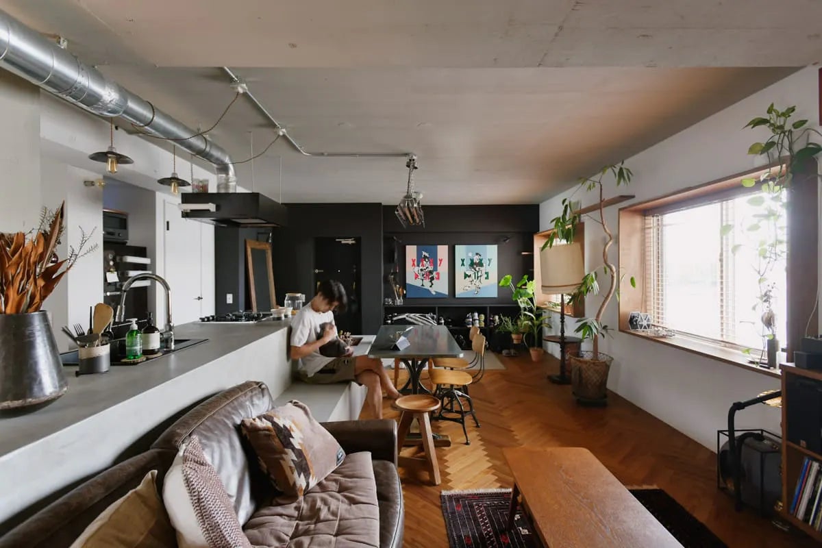多趣味で、住まいに絵になるシーンと機能性の両者を望む施主様のニーズを実現。78㎡もの広さをワンルーム感覚で使える仕様にして、リビングの一角にガラス張りの寝室や浴室、インナーテラスを配しました。効率よく動けて、愛する猫や多肉植物が風景の一部になる空間です。