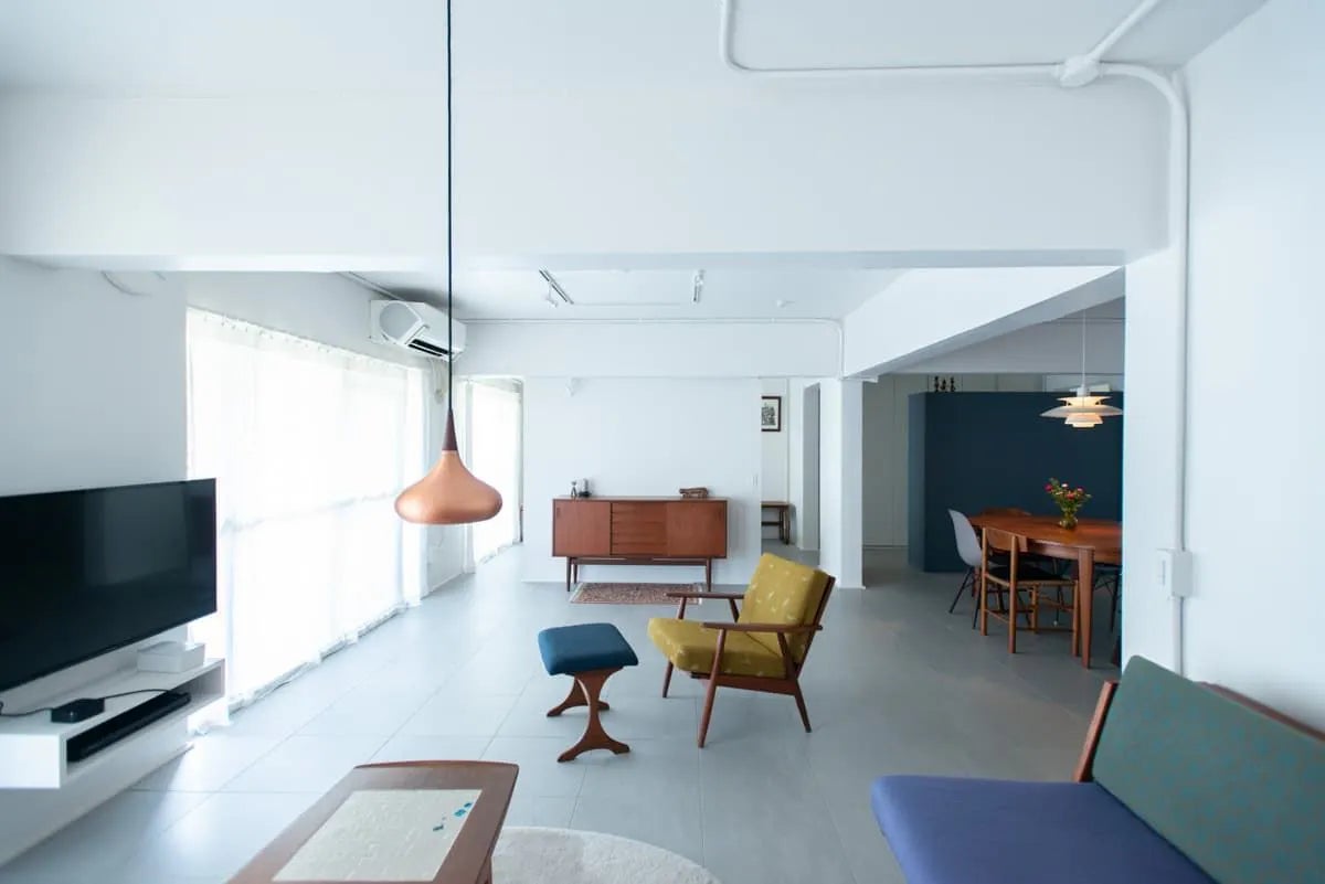 デンマーク駐在中に名作家具に魅了された施主様のために、家具を展示作品に見立てて美術館のような家づくりを。壁構造を活かしてドアを設けずに壁でゆるやかに空間を区切り、白い塗装の壁と白いタイルの床で光の反射を誘って、家具が美しく見える空間に仕上げました。