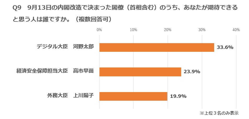内閣改造で決まった閣僚(首相含む)のうち期待できると思う人を複数回答で聞くと、上位3人は河野デジタル相33.6%、高市経済安全保障担当相23.9%、上川外相19.9%となった。