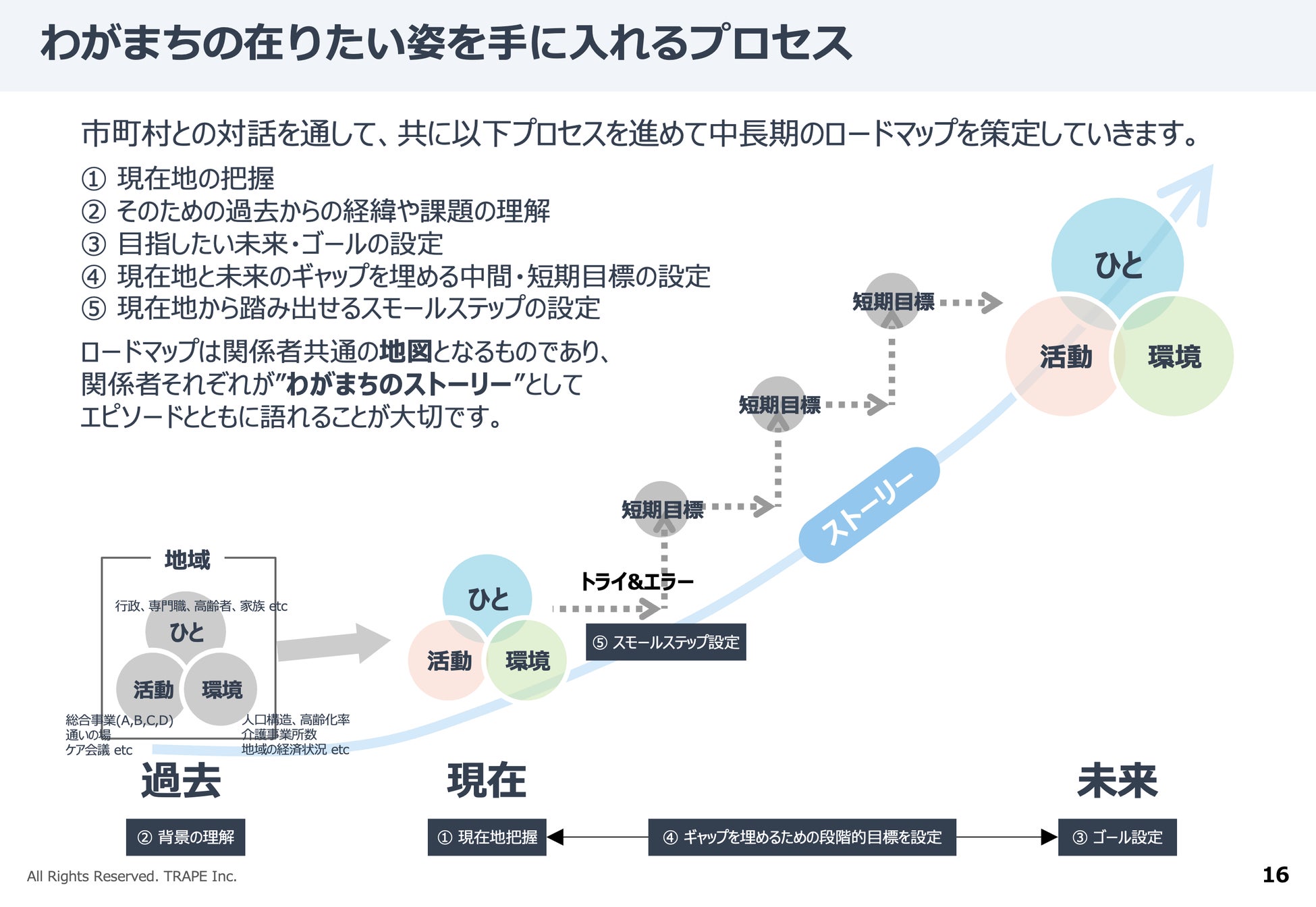 現状を把握し、ゴールを描き、そのギャップを埋める段階的な目標とスモールステップを設定。トライ&エラーを繰り返しながら、関係者全員が"わがまちのストーリー"として語れるロードマップを共に作り上げていきます。