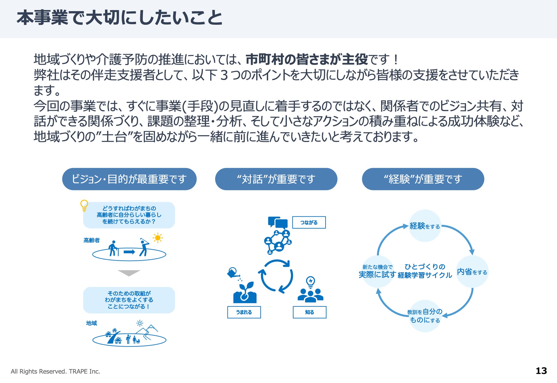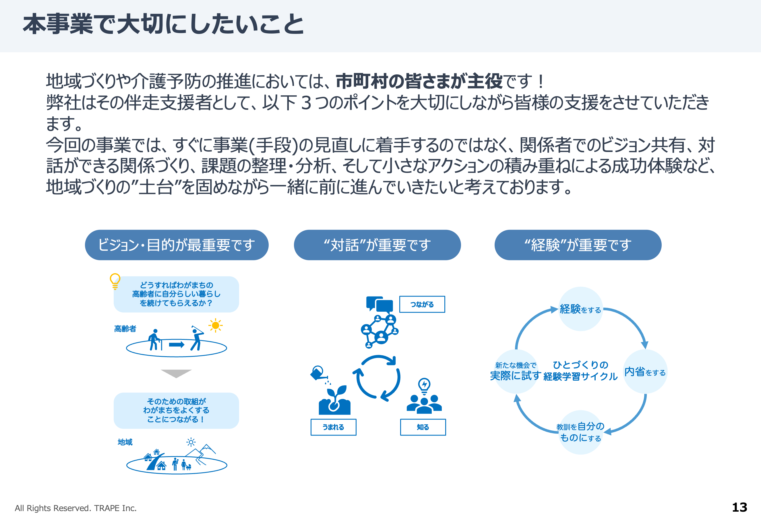 地域づくりや介護予防の推進において、主役は市町村の皆さまです。TRAPEはその伴走支援者として、次の3つのポイントを大切にしています。