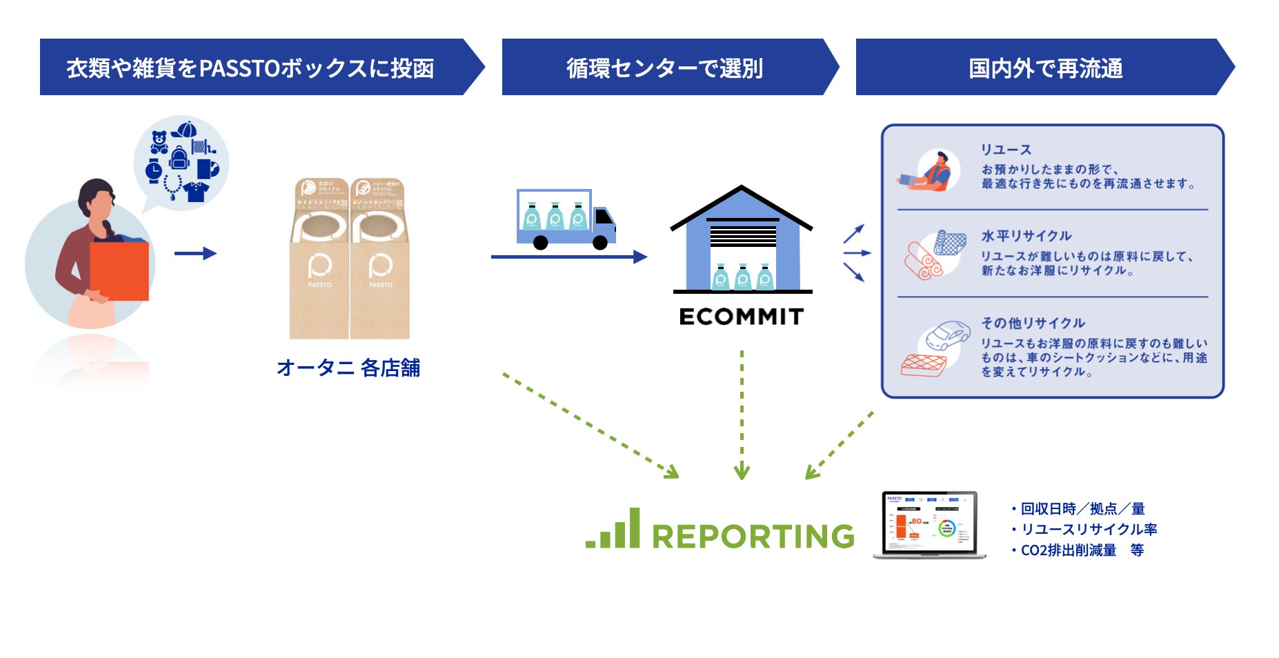 PASSTOは、持ち込まれた不要品を受け取り、ECOMMITが不要品の回収・選別・再流通を一気通貫で行うオリジナルブランドのサービスです。