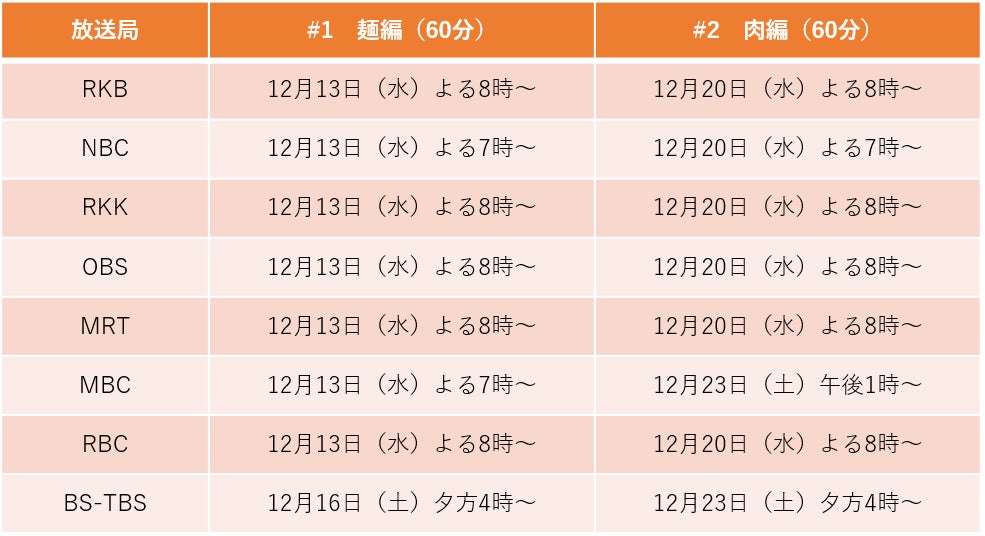 RKB毎日放送株式会社(放送エリア:福岡県・佐賀県)、長崎放送株式会社(長崎県)、株式会社大分放送(大分県)、株式会社熊本放送(熊本県)、株式会社宮崎放送(宮崎県)、株式会社南日本放送(鹿児島県)、琉球放送株式会社(沖縄県)のTBS系九州沖縄7局と株式会社BS-TBSは、2023年12月に「局対抗!愛しのグルメ選手権 九州沖縄食べにいき大賞」(麺編・肉編 各60分)を共同制作し、放送します。