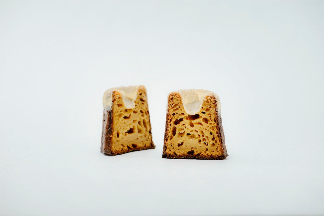 本場フランスではカヌレ生地にラム酒を使いますが、同商品は、日本酒の酒粕を生地に練りこみ、香りづけに芋焼酎を使用することで、ふんわりと酒の風味が漂い、カヌレ特有のしっとりむっちりとした食感に、ホワイトチョコレートの甘みとキャラメルのようなコクをお楽しみいただける日本風にアレンジし、仕上げています。