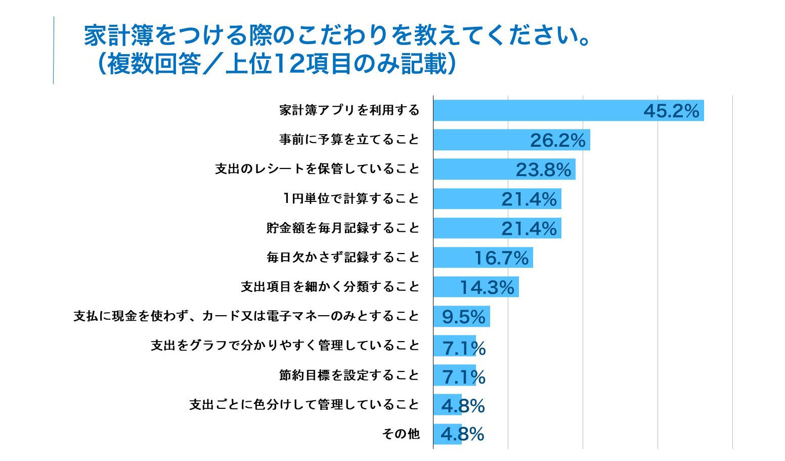 Q5で「はい」と回答した方に、「Q6.家計簿をつける際のこだわりを教えてください。(複数回答)」と質問したところ、「家計簿アプリを利用する」が45.2%、「事前に予算を立てること」が26.2%、「支出のレシートを保管していること」が23.8%という回答となりました。