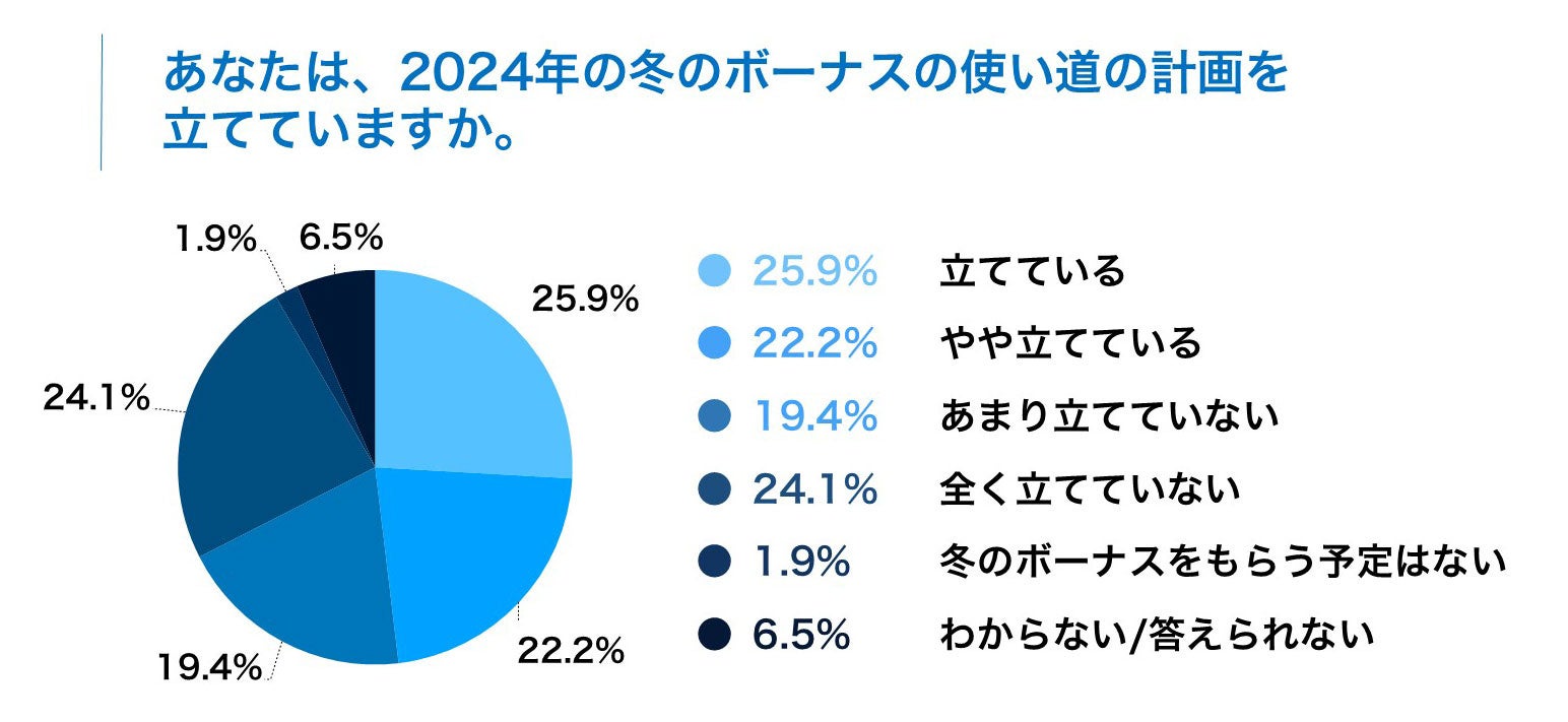 「Q3.あなたは、2024年の冬のボーナスの使い道の計画を立てていますか。」と質問したところ、「立てている」が25.9%、「やや立てている」が22.2%という回答となりました。