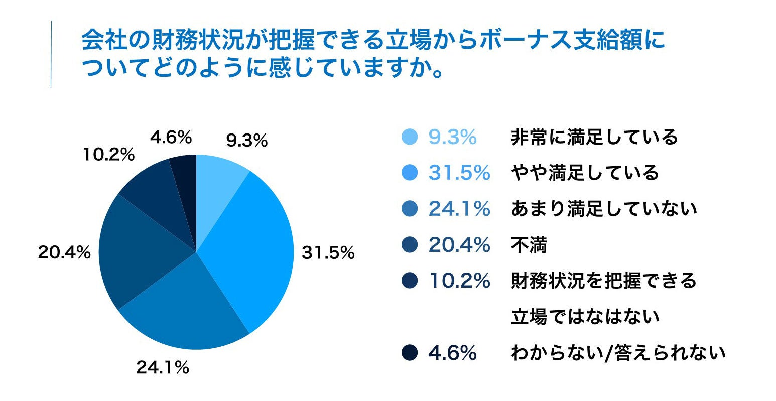 「Q9.会社の財務状況が把握できる立場からボーナス支給額についてどのように感じていますか。」と質問したところ、「あまり満足していない」が24.1%、「不満」が20.4%という回答となりました。