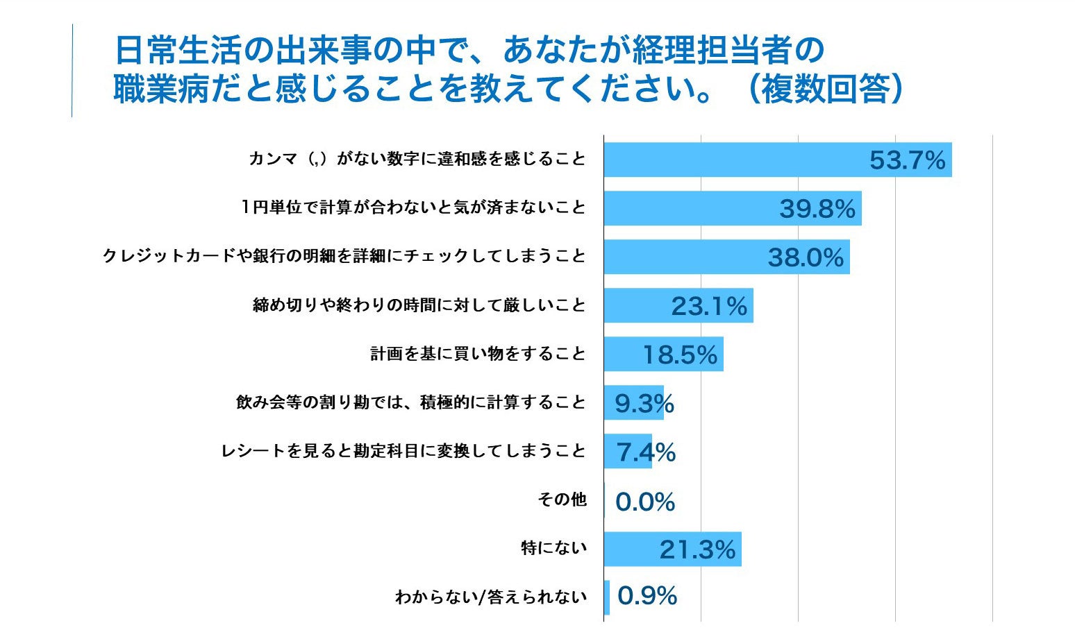 【Q7】経理の職業病だと感じること、「カンマがない数字に違和感」(53.7%)、「1円単位で計算が合わないと気が済まない」(39.8%)