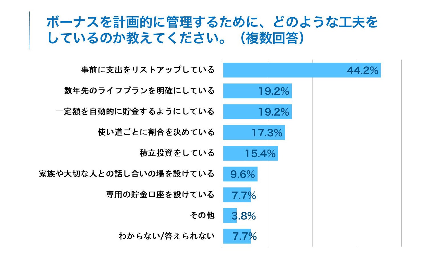 Q3で「立てている」「やや立てている」と回答した方に、「Q4.ボーナスを計画的に管理するために、どのような工夫をしているのか教えてください。(複数回答)」と質問したところ、「事前に支出をリストアップしている」が44.2%、「数年先のライフプランを明確にしている」が19.2%、「一定額を自動的に貯金するようにしている」が19.2%という回答となりました。