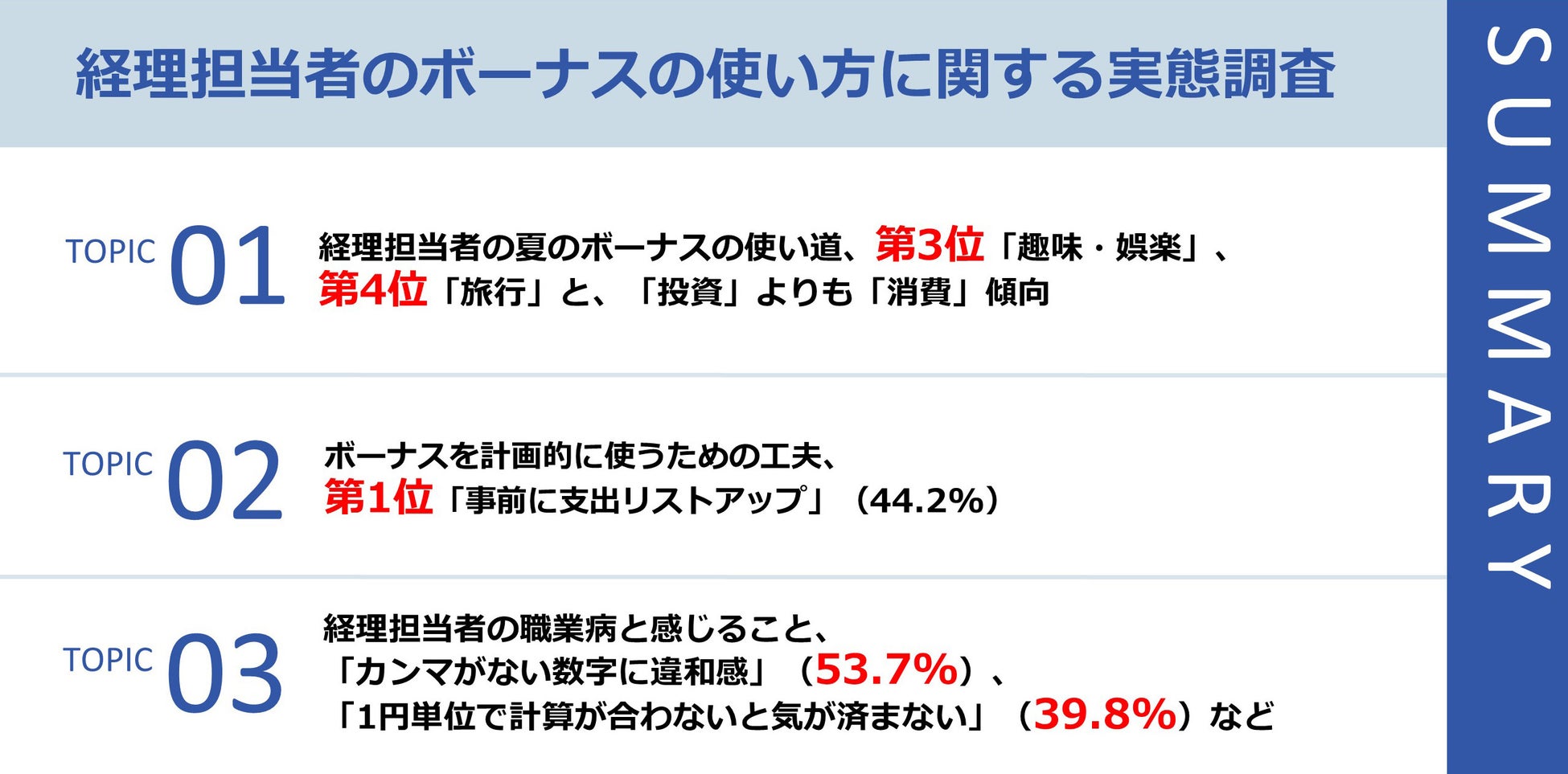 まず、最も多い夏のボーナスの使い道は、「貯金」(72.2%)、「生活費の補填」(27.8%)と続き、「投資・資産運用」(17.6%)よりも、「趣味・娯楽」(25.0%)や「旅行」(21.3%)などの消費傾向が見られました。「投資・資産運用」にボーナスを回している人は、26.3%がボーナスの「40%~60%未満」を投資に充てています。一方、冬のボーナスの使い道を計画している人は約半数で、計画的にボーナスを管理する工夫として「事前に支出をリストアップしている」(44.2%)が最も多く見られました。さらに、約4割の経理担当者が家計簿をつけており、「家計簿アプリを利用している」(45.2%)や「支出項目を細かく分類している」などの家計簿へのこだわりが明らかになりました。最後に、経理担当者の職業病として「カンマがない数字に違和感を感じる」(53.7%)や「1円単位で計算が合わないと気が済まない」(39.8%)などの自覚があるようです。
