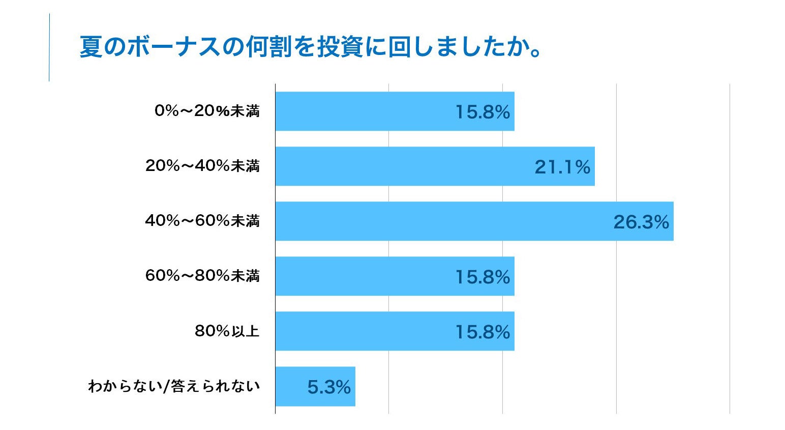 Q1で「投資・資産運用」と回答した方に、「Q2.夏のボーナスの何割を投資に回しましたか。」と質問したところ、「40%~60%未満」が26.3%、「20%~40%未満」が21.1%、「0%~20%未満」が15.8%という回答となりました。