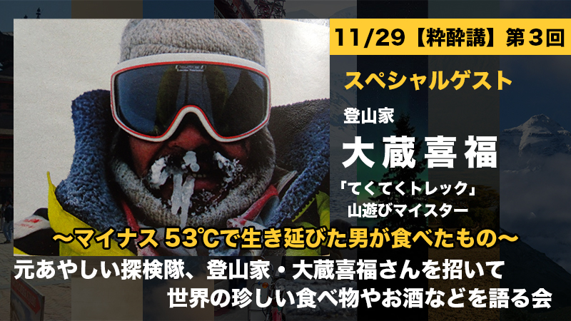 “歩く”がテーマの参加体験型サービス「てくてくトレック」で、【粋酔講・元あやしい探検隊、写真家・佐藤秀明さんを招いて世界の珍しい食べ物やお酒などを語る会】を開催