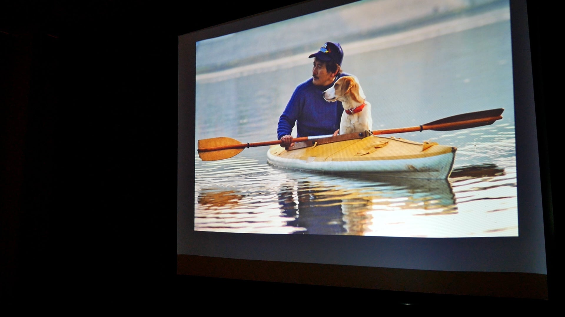 イベント会場で投影した写真(カヌー犬第1号の「ネコ」と野田さん)