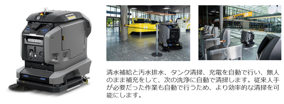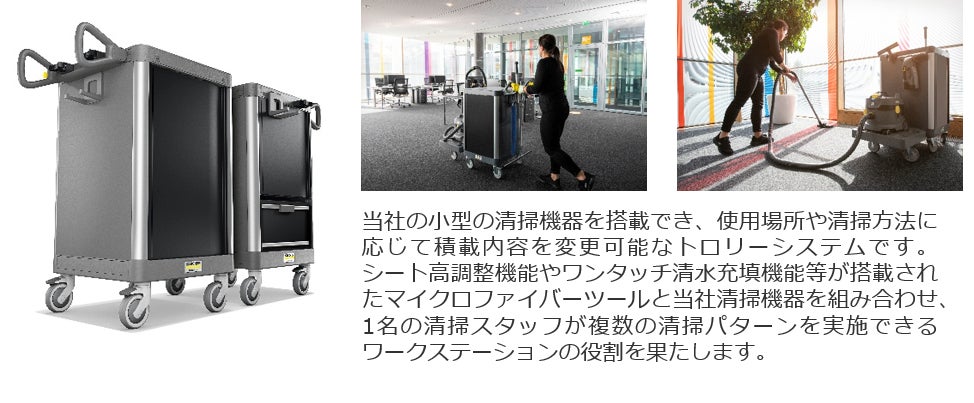 展示ブースでは、「次世代の清掃スタイルをトータル提案します」をメッセージとし、ビルメン業界における人手不足や清掃従事者の労働時間等の課題を解決する、IoTやロボット技術を活用した清掃ソリューションをご紹介いたします。ケルヒャー製品をまとめて持ち運べることで、 1名の清掃スタッフで複数の清掃パターンを実施出来る清掃用トロリー『FlexoMate』や、清水補給と汚水排水、タンク清掃、充電といった作業を自動で行う、床洗浄ロボット『KIRA B 50』などの新製品を紹介。また、進化したバッテリー技術で、電源コードが無いエリアでもコード式清掃機器とパワーが変わらず清掃できる、バッテリーユニバースシリーズ商品7製品等も展示 します。