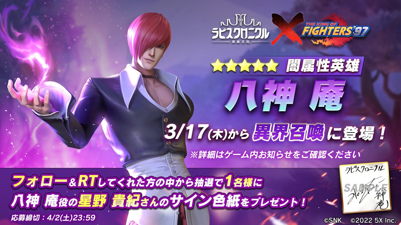 『ラピスクロニクル -英雄王冠-』✖️『KOF ’97』コラボ開催中!新たな英雄【復讐の蒼き炎】八神庵が登場!