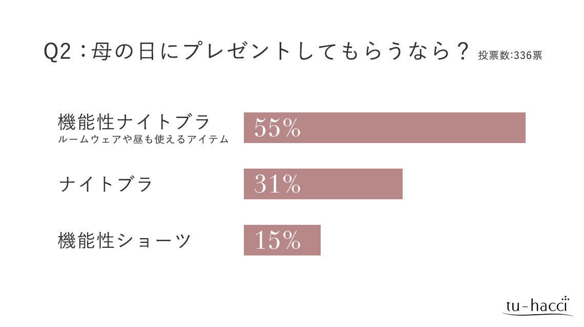 tu-hacciの公式Instagramでお子さんをお持ちの女性の方に、普段の下着の買い替え時期や、母の日に貰ったら嬉しいアイテムに関するアンケート*を実施しました。皆様からいただいた回答を元に『母の日におすすめしたい』tu-hacciのインナーアイテムをご紹介します。
