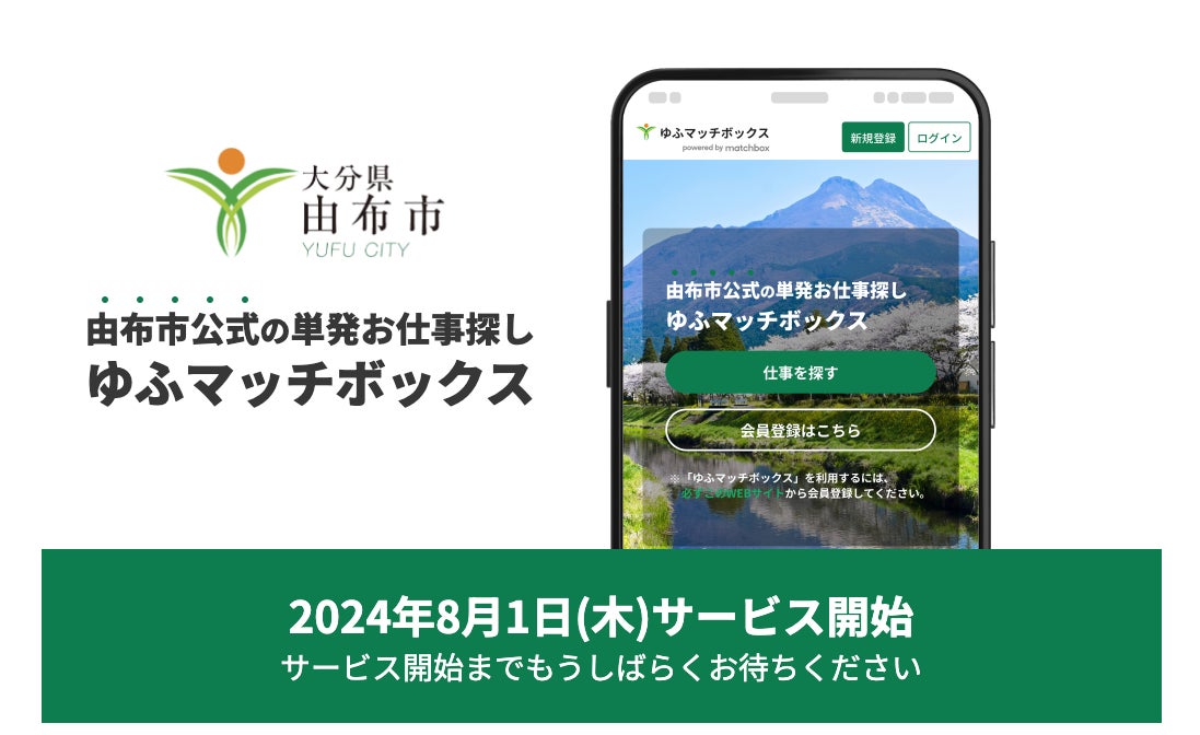 株式会社Matchbox Technologies(マッチボックステクノロジーズ 本社:新潟県新潟市中央区、代表取締役社⻑:佐藤 洋彰)は1回・数時間単位の求人と働き手をオンラインでマッチングする自治体公式のスポットワークプラットフォームの構築・運用をサポートしています。この度、大分県由布市(市長:相馬 尊重 そうま たかしげ)はマッチボックステクノロジーズと「令和6年度由布市就労機会促進事業業務」を8月1日(木)より開始いたします。本事業により大分県由布市は公式のスポットワークプラットフォーム「ゆふマッチボックス」(URL:https://matchbox.jp/oita/yufu 8月1日オープン予定)の開設とアプリケーションの提供を行います。それに先駆けて、7月10日(水)より、「ゆふマッチボックス」事業者登録専用サイト(URL:https://matchbox.jp/oita/yufu/dx-project)をオープンしました。利⽤企業は大分県由布市を就業地とした求⼈を登録でき、求人は「ゆふマッチボックス」のwebサイトおよびアプリケーション上に集約され、全国から閲覧・応募することができるようになります。大分県の自治体が公式スポットワークプラットフォームを開設するのは初めてです。