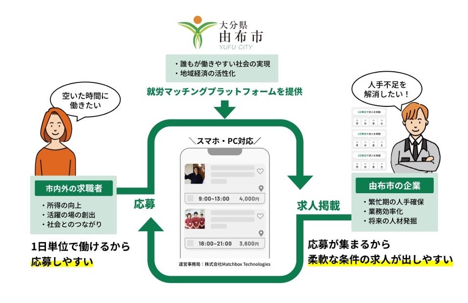 由布市は本事業を通じ、デジタルでの就業環境を整備し、市内企業の慢性的な人手不足緩和に向け、世代や性別を問わず、全ての人が多様で柔軟な働き方ができる環境の構築を図ります。プラットフォームはマッチボックステクノロジーズが管理保守・運用を行い、企業・事業所はマッチボックステクノロジーズに利用申し込みを行います。
