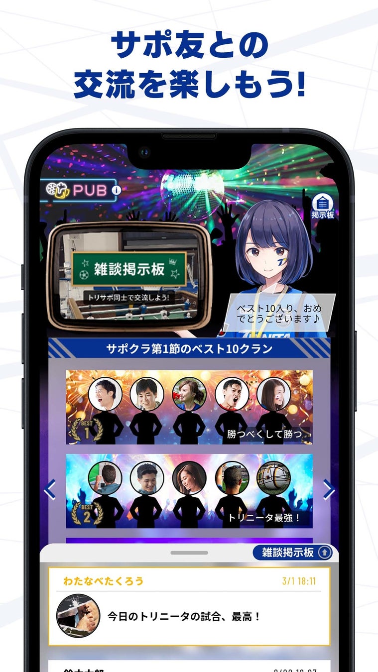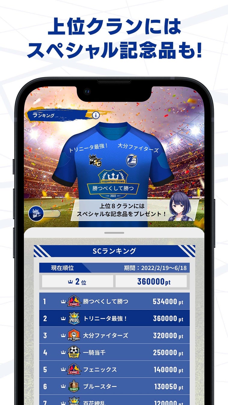 その第2弾となる「大分トリニータ公式サポーターズクラウン」は、トリサポ仲間が毎日集まる場をゲームというカタチで提供しています。大分在住の方はもちろん、都心などにお住まいのトリサポの方にも楽しめる要素をたくさん盛り込んでいます。例えば、毎日開催の試合スタッツ連動ゲームやクランランキングなどはグループ同士で競い合うので、別々に暮らす家族や兄弟、学生時代の友人、遠く離れたトリサポ仲間など、気の合う仲間と一緒に楽しむことができます。