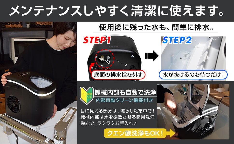 機械内部に水を循環させる自動簡易洗浄してくれる、内部自動クリーン機能付き。