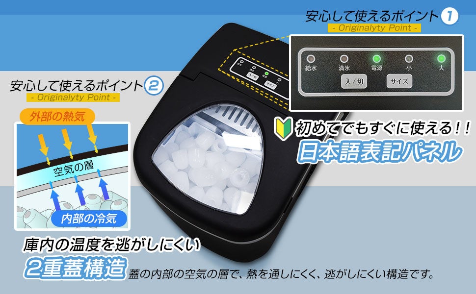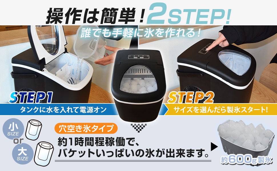 タンクに水を入れ、氷のサイズを選んでスイッチを押すだけの超簡単操作!