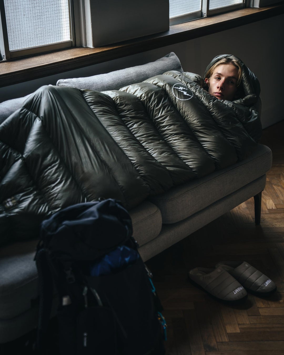 アウトドアフィールドという過酷な環境下で培った寝袋作りの技術と知見を詰め込んだ、羽毛布団をはじめとする寝具レーベル“GOOD SLEEPING”にfragmentのデザインを落とし込んだエクスクルーシブなコラボレーションとなっています。