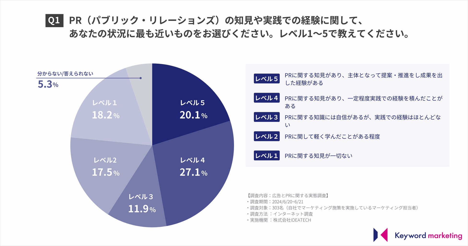 PR(パブリック・リレーションズ)の知見や実践での経験に関して、現在の状況に最も近いものをレベル別に聞いたところ、「実践経験がある」を含むレベル4・5と回答したのは全体の47.2%という結果となりました。