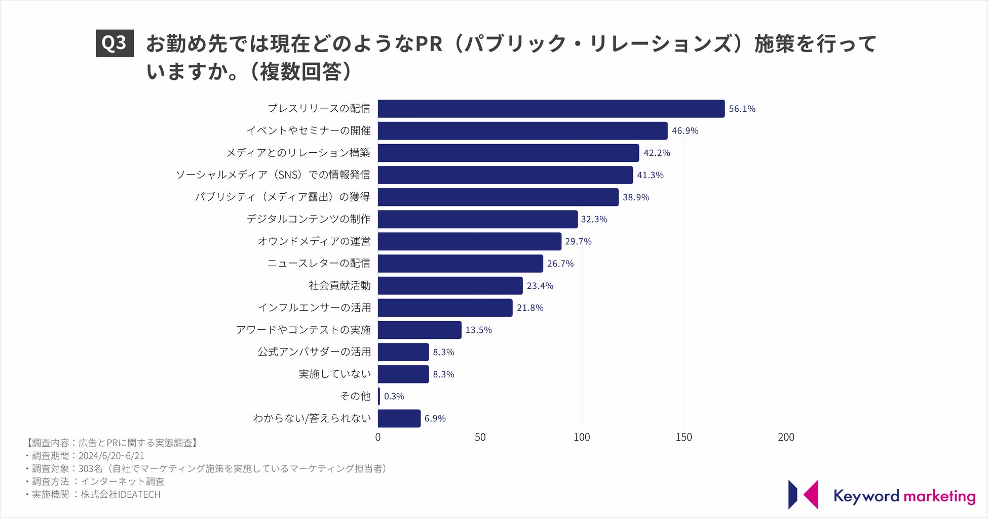 また、現在どのようなPR(パブリック・リレーションズ)施策を行っているか尋ねたところ、56.1%がプレスリリースの配信、46.9%がイベントやセミナーの開催、42.2%がメディアとのリレーション構築と回答しました。
