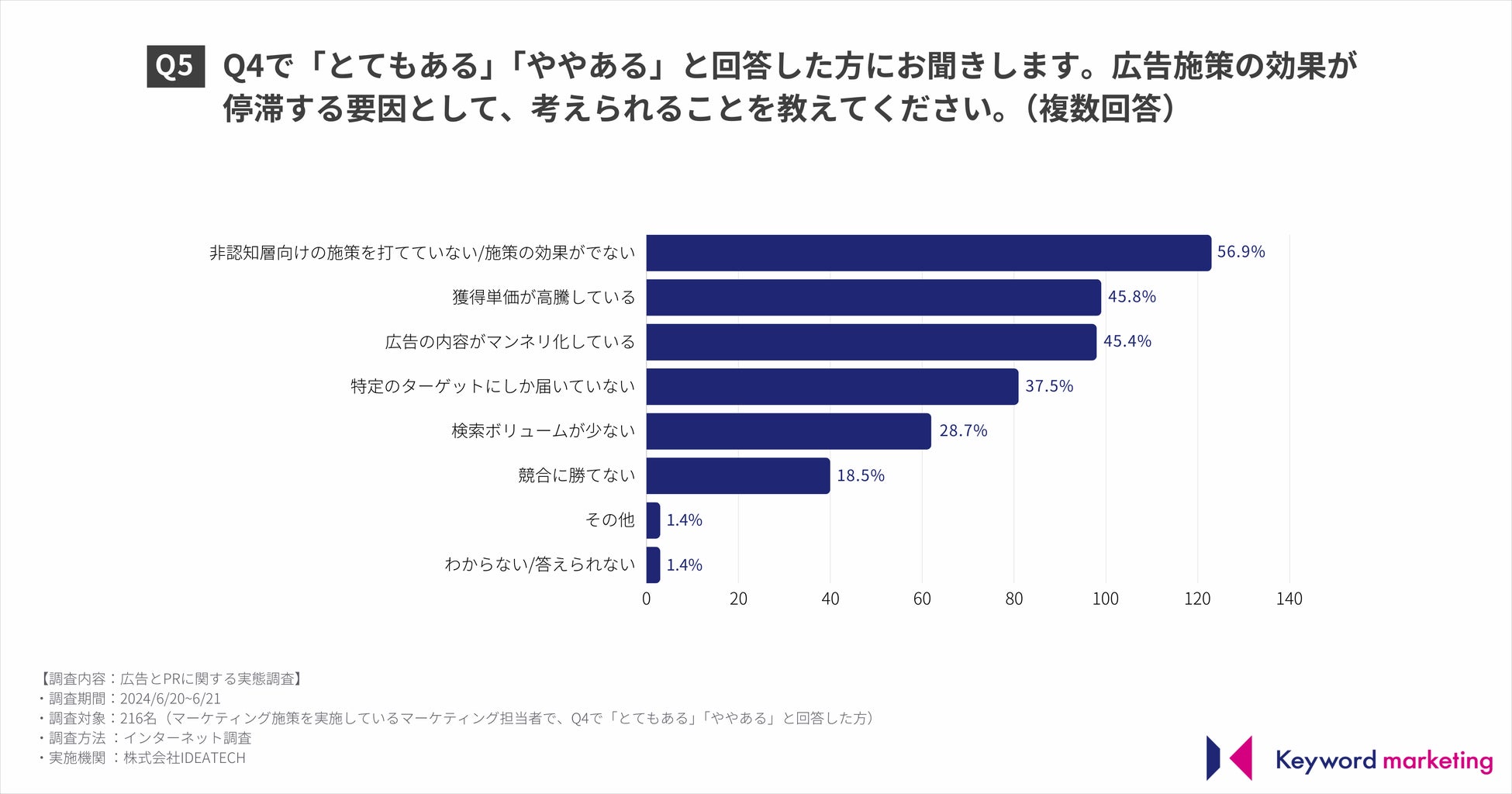 Q4で「とてもある」「ややある」と回答した方を対象に、広告施策の効果が停滞する要因として、考えられることを聞いたところ、56.9%が「非認知層向けの施策を打てていない/施策の効果がでない」、45.8%が「獲得単価が高騰している」、45.4%が「広告の内容がマンネリ化している」と回答しました。
