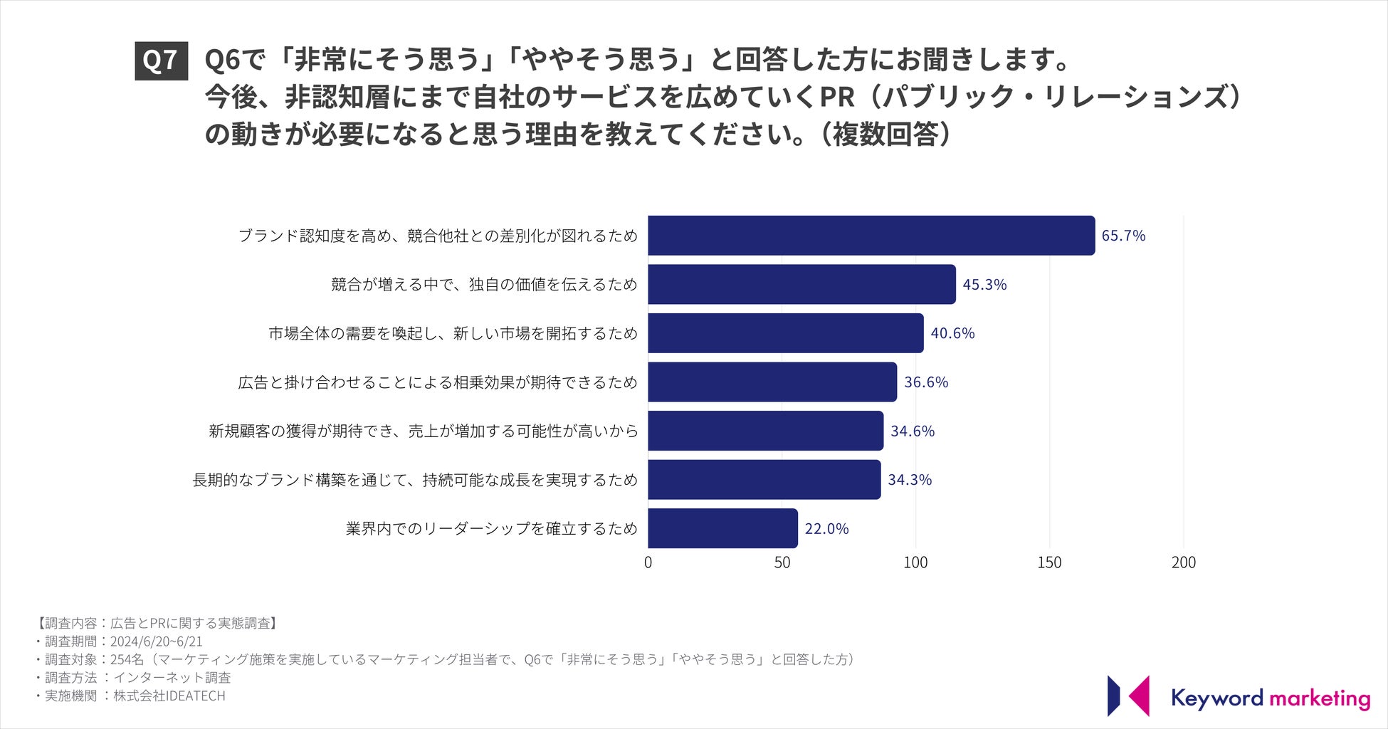Q6で「非常にそう思う」「ややそう思う」と回答した方に対し、その理由を尋ねたところ、65.7%が「ブランド認知度を高め、競合他社との差別化が図れるため」、45.3%が「競合が増える中で独自の価値を伝えるため」、40.6%が「市場全体の需要を喚起し、新しい市場を開拓するため」と回答しました。
