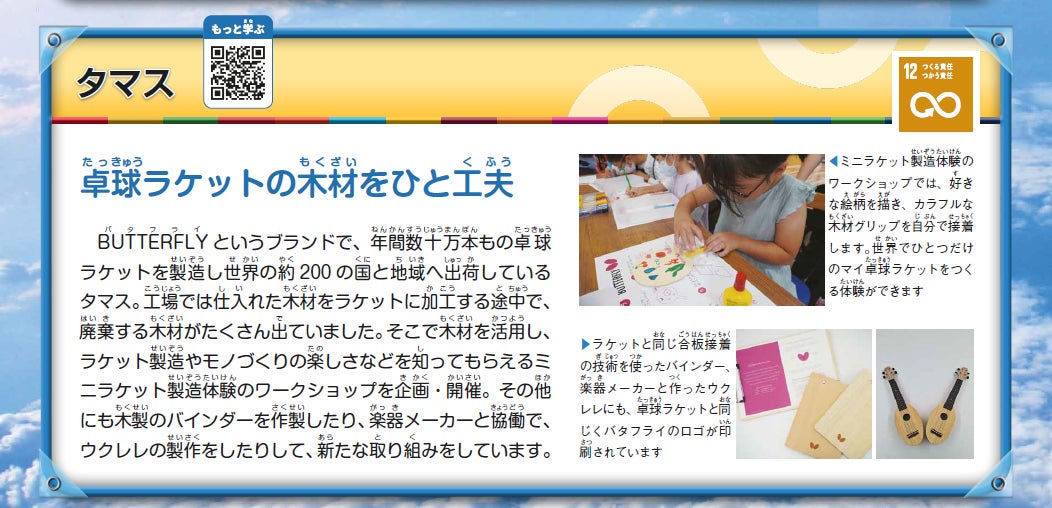 「おしごと年鑑」では、子どもにもわかりやすい視点から協賛企業の仕事内容が紹介されています。その中で、当社は「卓球選手を支える仕事」という視点で掲載されています。スポーツ選手に憧れる子どもが多くいる中、選手を支える立場からスポーツに携わる仕事もあり、このことに気付くきっかけにしていただきたいとの思いを込めました。