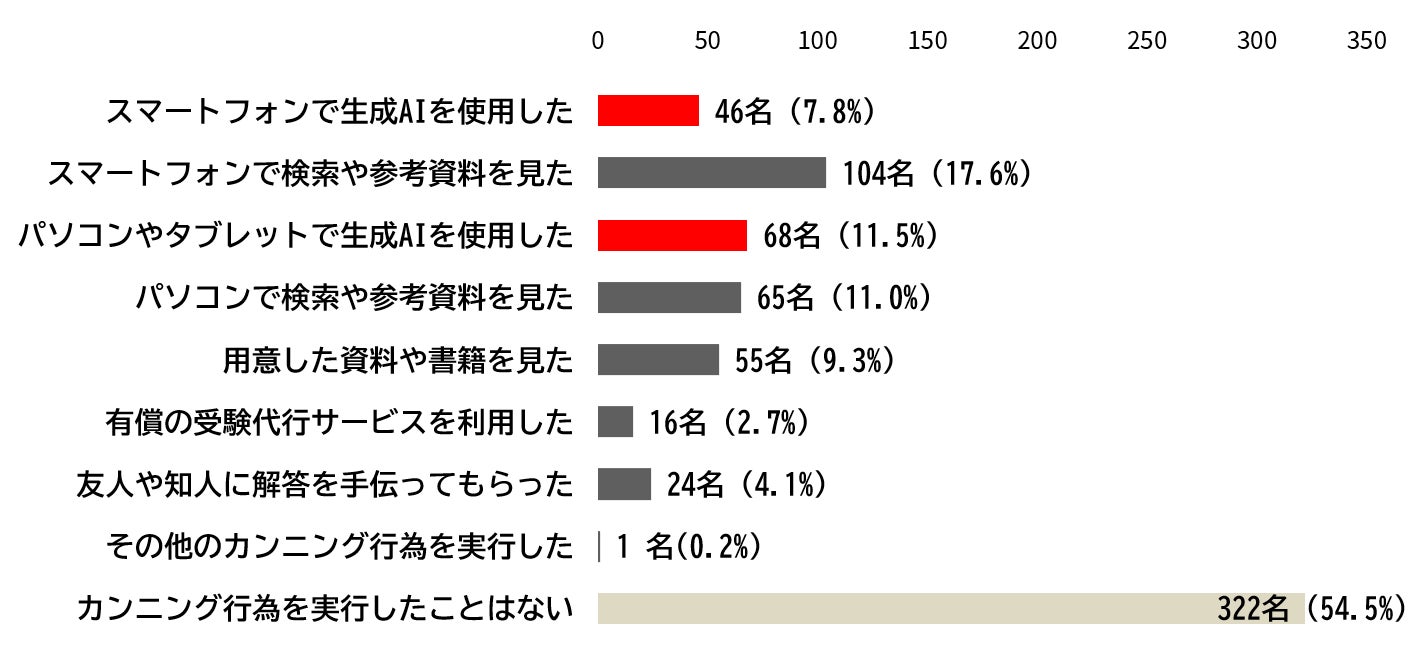 調査対象者591名のうち、45.5%にあたる269名が自宅などで受験したオンライン試験で「何らかのカンニング」を実行したと回答しました。カンニングを行わなかったのは54.5%(322名)に留まります。特に生成AIを利用した不正行為が従来の「替え玉受験」を上回っており、生成AIの普及により不正行為がより手軽になった可能性が示されています。